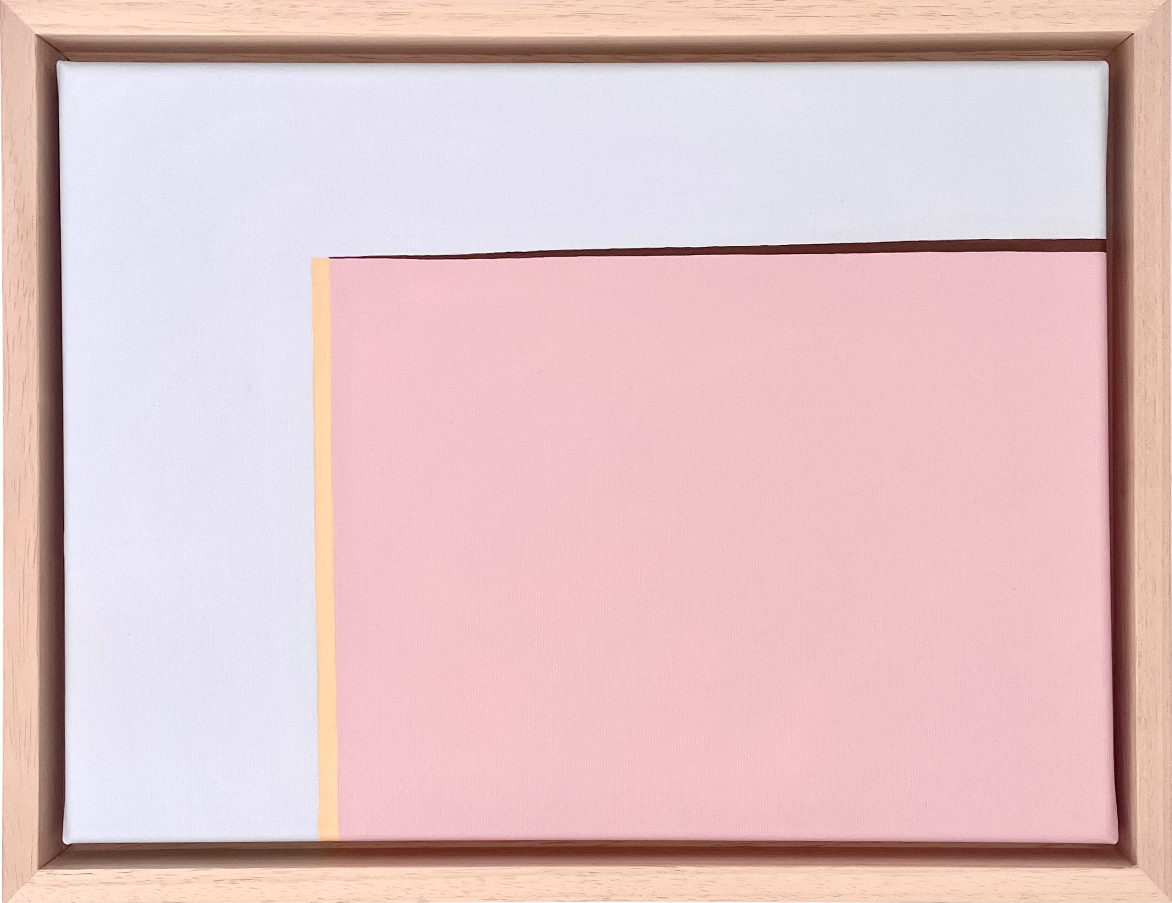 Dzieło “H001” z cyklu “Horyzonty” Magdaleny Nowatkowskiej to przykład malarstwa, w którym dominuje spokój i wyważona kompozycja. Obraz składa się z prostokątnych bloków kolorów: pastelowego różu, ciepłego beżu i subtelnej szarości, rozdzielonych przez cienką, pionową linię złota.