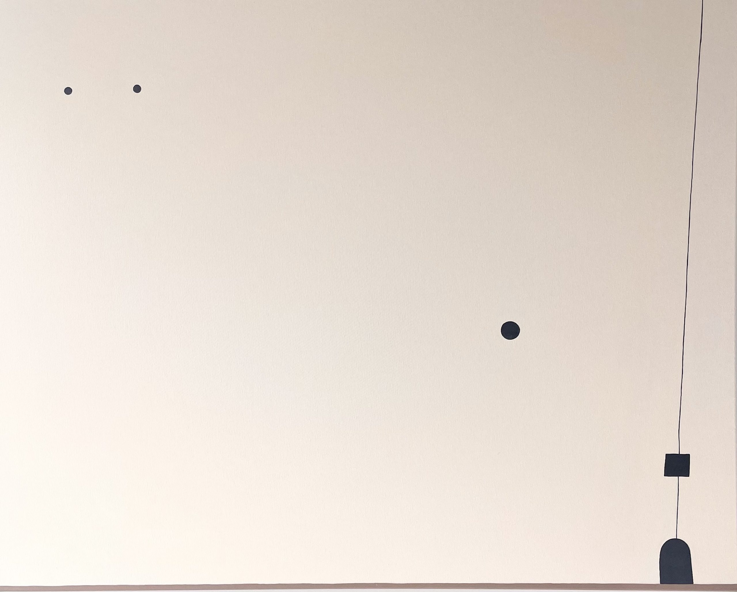 Obraz “Instalacja” z cyklu “Obrazy zapożyczone” Magdaleny Nowatkowskiej to dzieło, które łączy w sobie elementy minimalizmu i konceptualizmu. Na jednolitym, stonowanym tle umieszczone są nieliczne, ale znaczące elementy: kilka czarnych kropek o różnych rozmiarach oraz kształtów, które zdają się tworzyć subtelną, wizualną narrację na przestrzeni płótna.